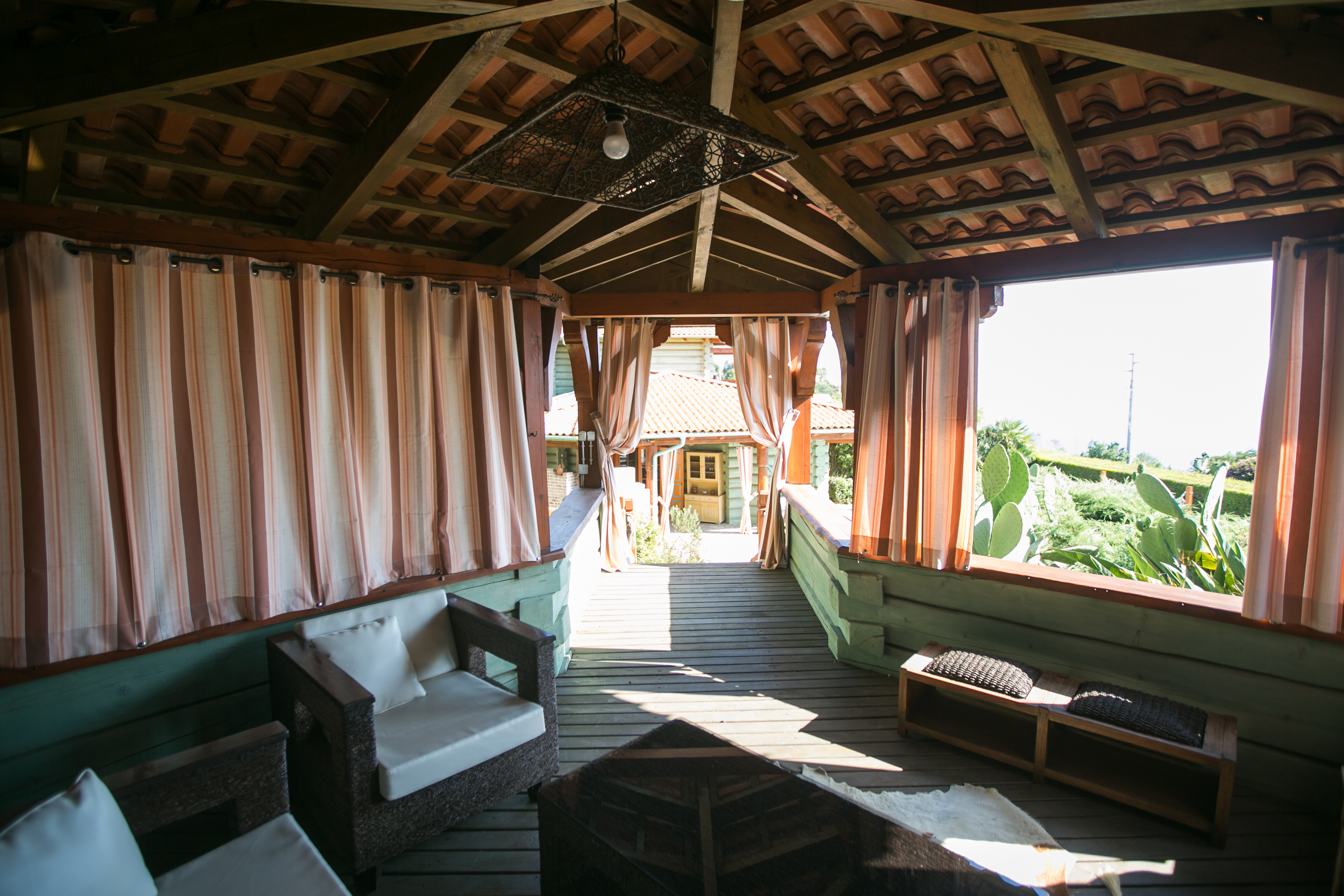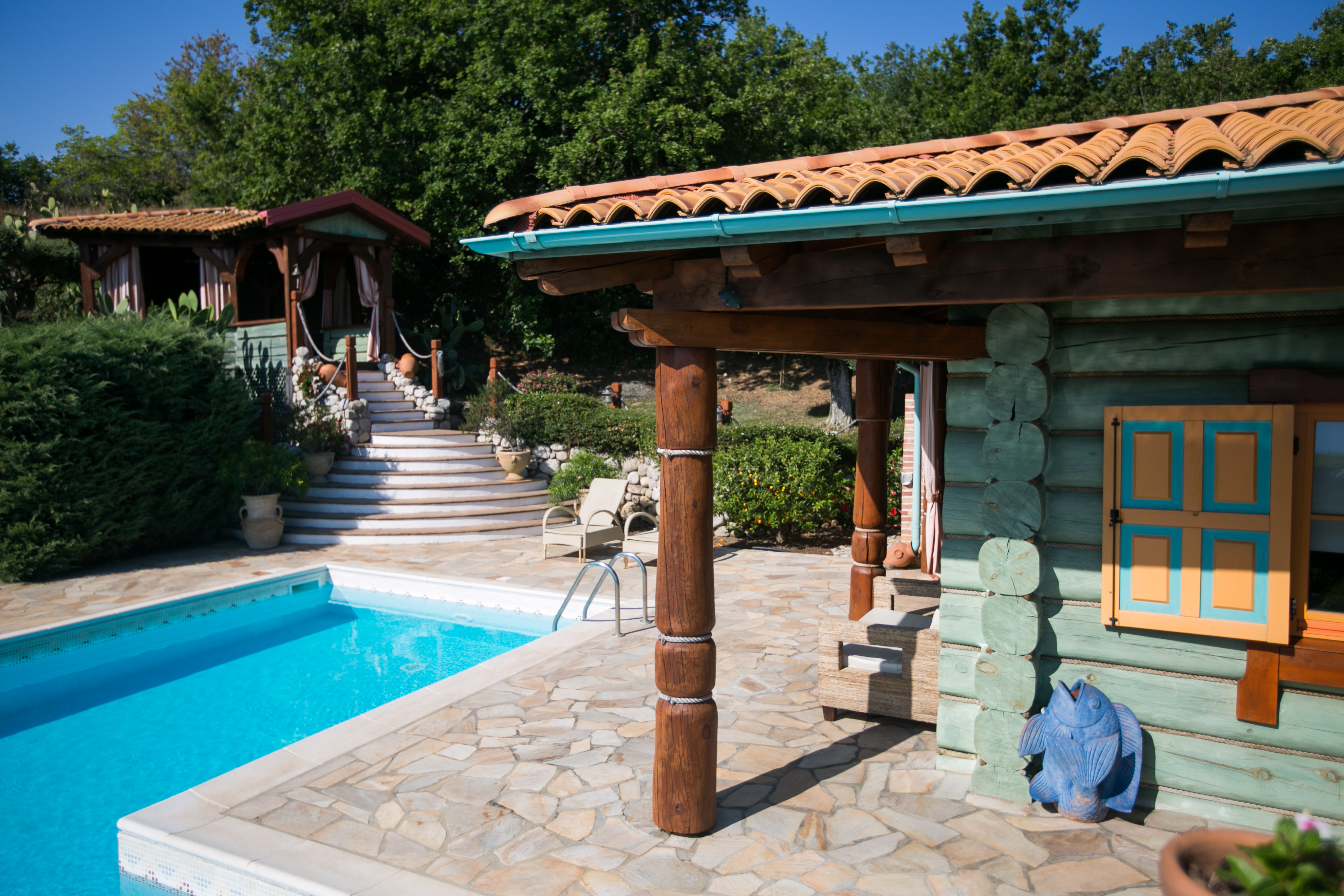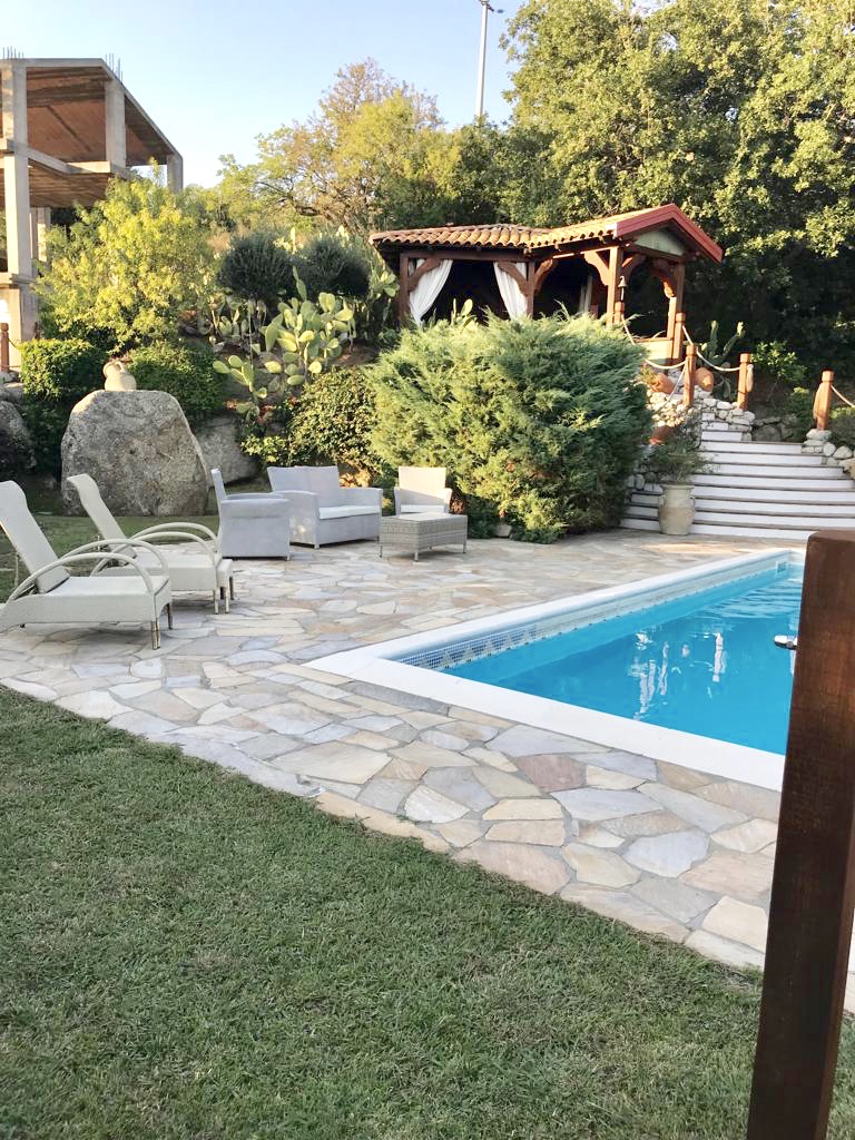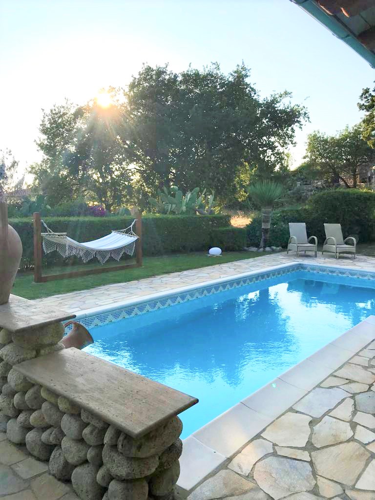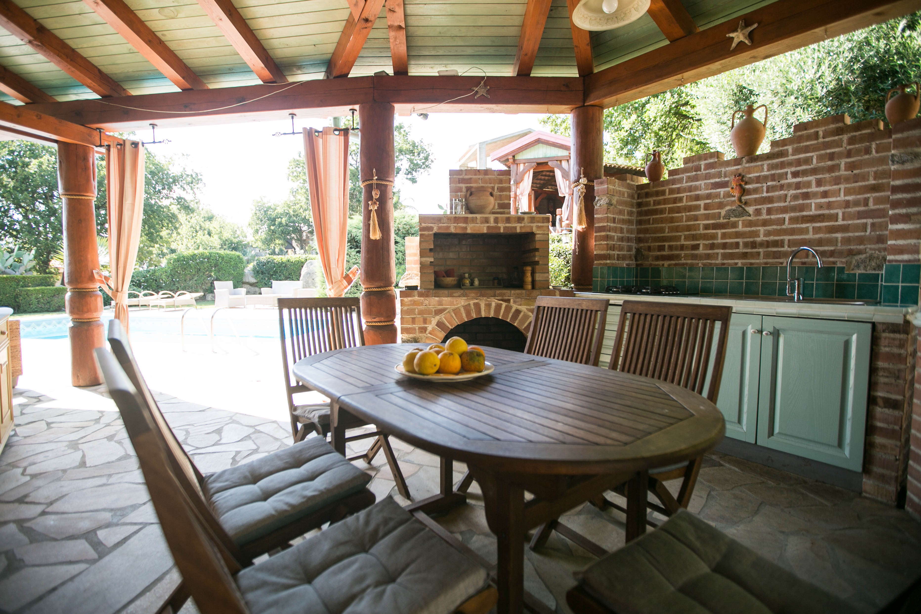 Centrum ogrodu stanowi podświetlany basen z leżakami, nieopodal którego znajduje się otwarta jadalnia z aneksem kuchennym, w którym można przygotowywać świeże posiłki i przekąski. Na podwyższeniu w pobliżu basenu stoi altanka ze strefą wypoczynkową, w tym telewizorem i sprzętem DVD. Ogrodzenie domu zapewnia gościom dyskrecję i prywatność.
