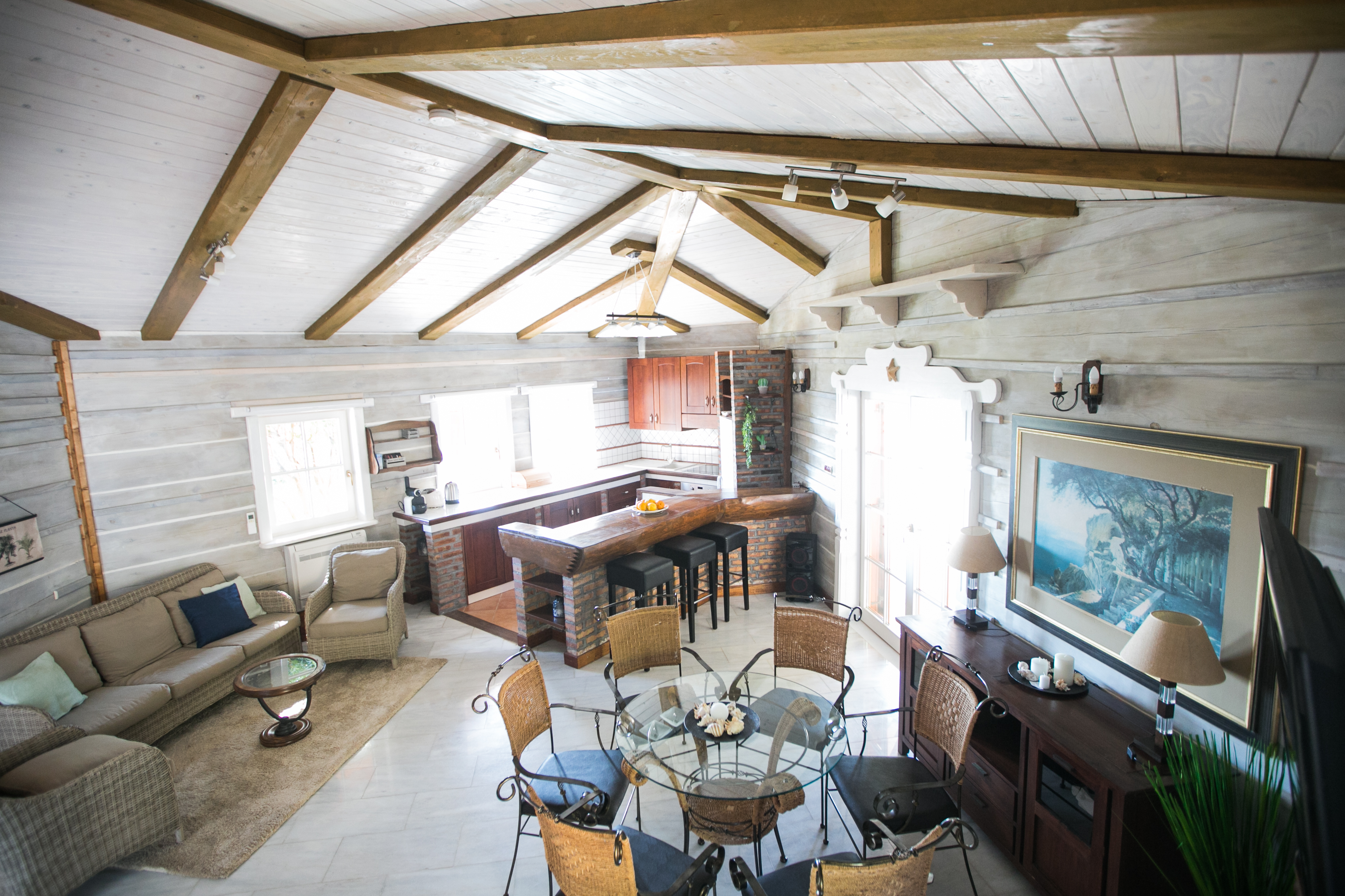 - kuchnia (w pełni wyposażona) z salonem z kominkiem i jadalnią